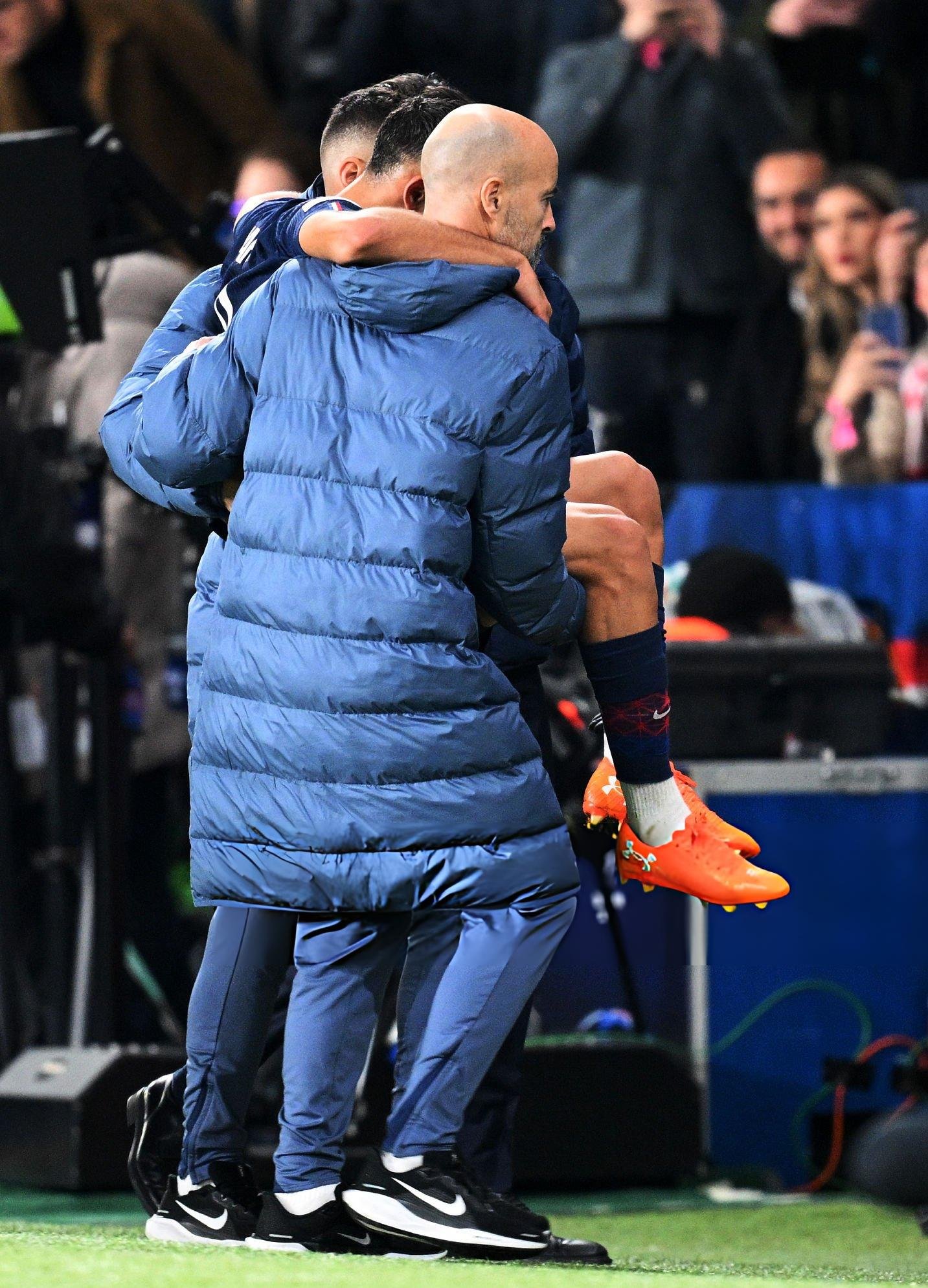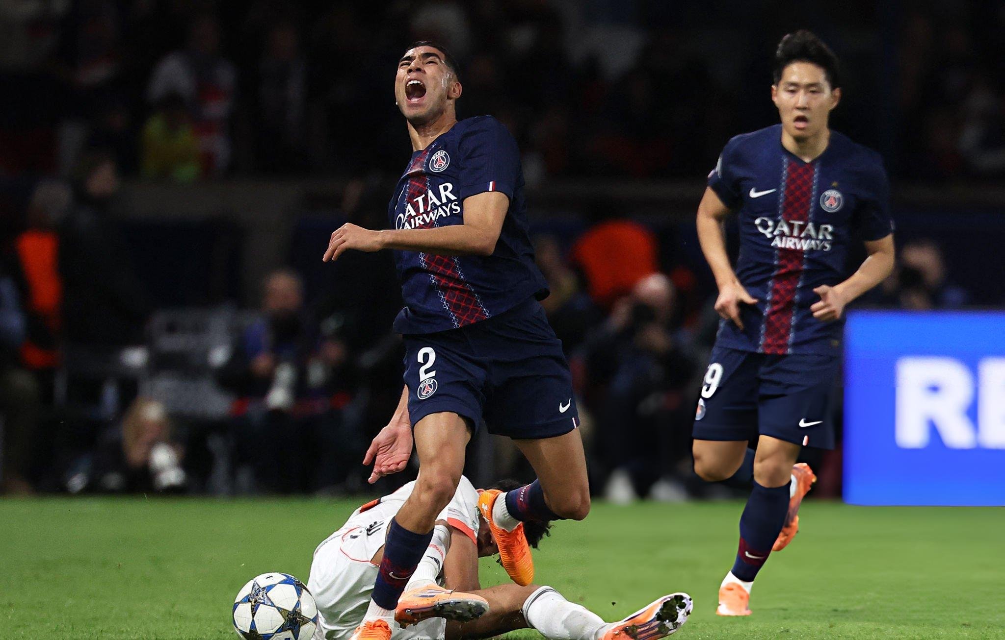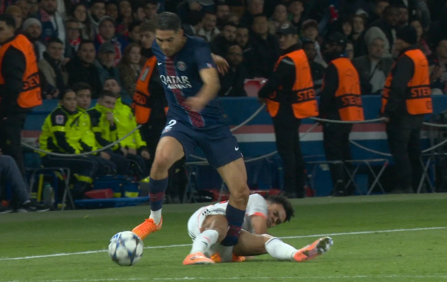 Yayın tekrarları acımasızdı. Atlayışın kendisi fazlasıyla agresifti ve Hakimi'nin ayak bileği rakibin bacakları arasında adeta "makas" oldu. Hakem hemen monitöre çağrıldı ve kartın ağırlığı doğal olarak kırmızıya yükseldi. “PSG”nin doktorları hasarlı bilekle ilgilenirken Faslı oyuncunun yüzünde gözyaşları parlıyordu. Devam etmesi imkânsızdı; değişiklik anında geldi.