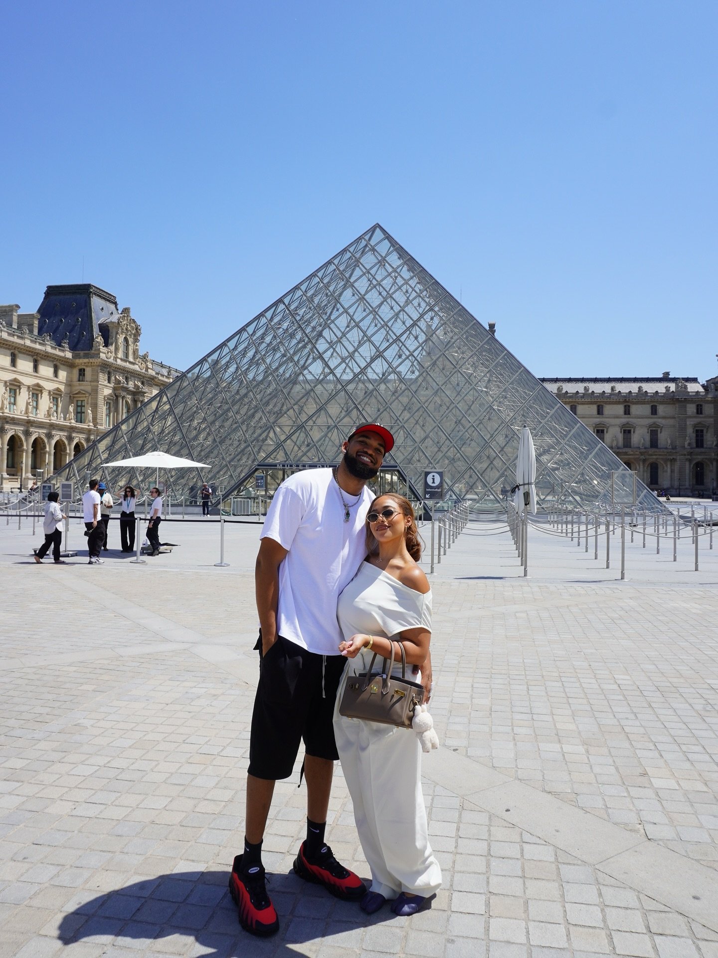 Galeride başka kareler de var: Bazılarında çift, VIP misafirlere bile nadiren tanınan bir ayrıcalıkla efsanevi tabloya adeta dokunacak kadar yakın duruyor; bazılarında ise Louvre’un cam Piramidi önünde poz veriyorlar. Jordyn, omuzları açık zarif beyaz bir tulum tercih ederken Karl-Anthony rahat bir yaz kombinini seçti: oversize beyaz tişört ve diz boyu siyah şort. Stil farkına rağmen ikili son derece uyumlu görünüyordu; tıpkı parkede Towns’ın pozisyon becerileriyle taraftar desteğinin birleşmesi gibi.