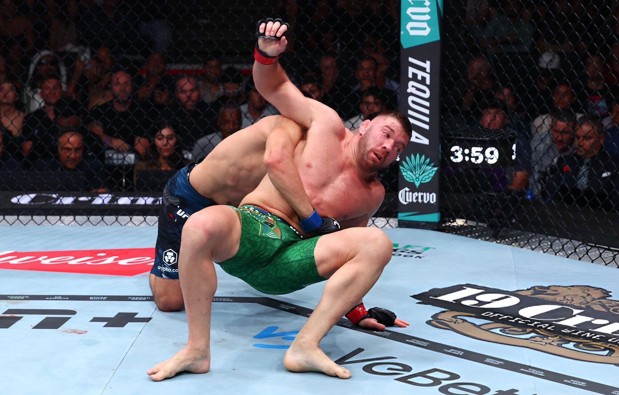 Danis’in çizdiği senaryo: bacaklara dalışı kışkırtmak — anında boyun bağlantısını yakalayıp (giyotin/D’Arce) bitirmek ya da bir scramble’a taşıyıp sırta geçiş ve klasik rear-naked choke. Alternatif — side control’den arm-triangle choke’a veya rakip dirseğini içeride bıraktığında armbar (kol kilidi) denemek.