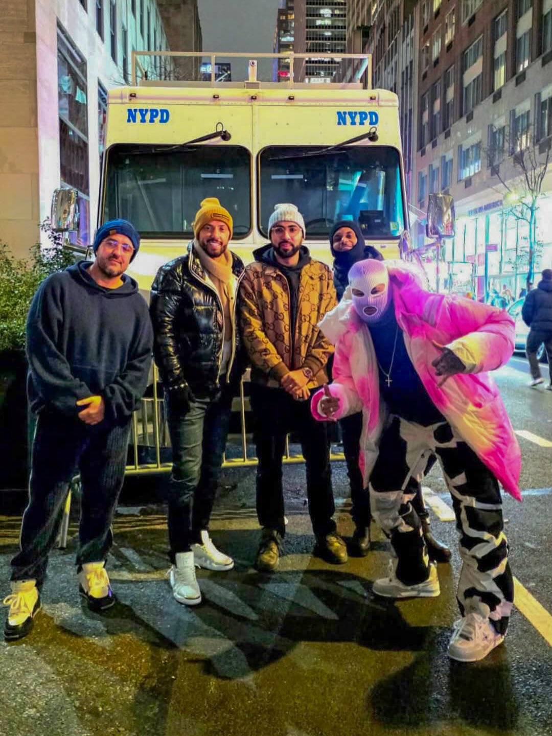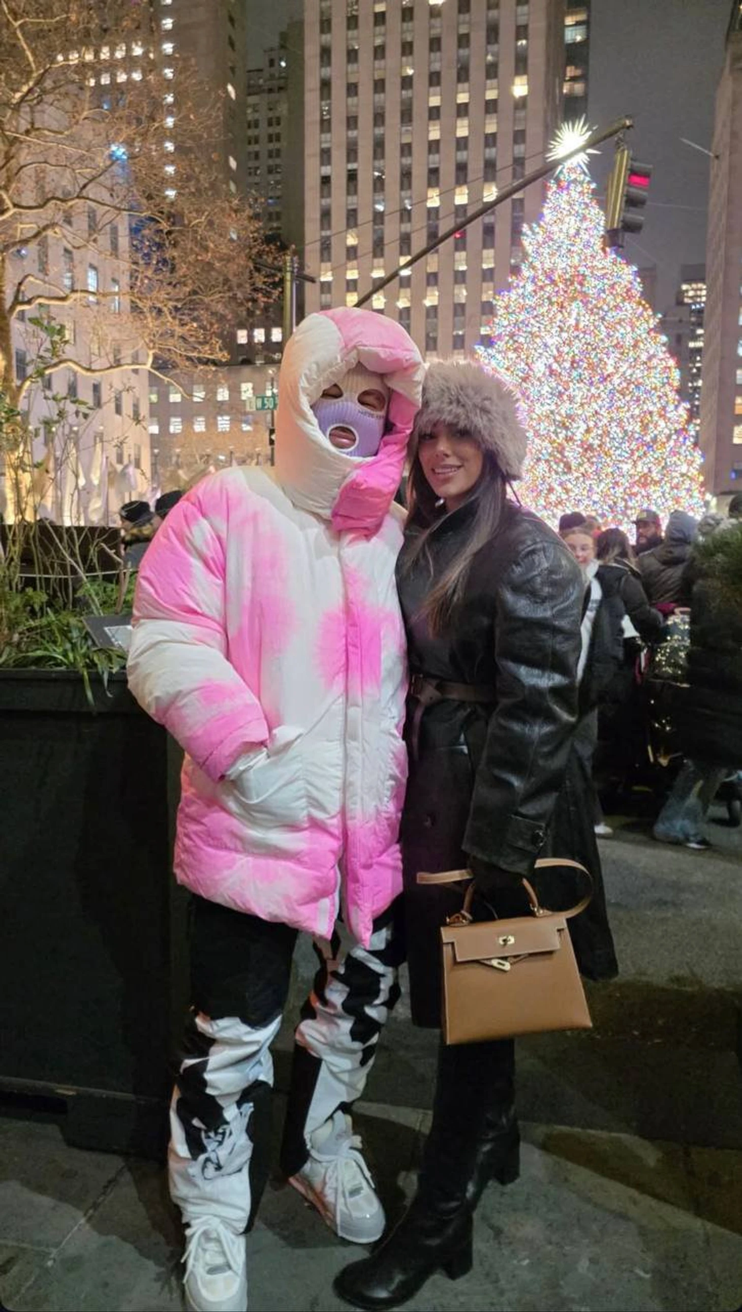“Ekipman”ın ana parçası, başı neredeyse tamamen örten kapüşonlu, beyaz-pembe hacimli bir Louis Vuitton şişme monttu. Görüntüyü ise yalnızca gözler ve ağız için açıklıkları bulunan lila-beyaz bir balaklava tamamladı. Sonuçta moda, adeta bir kalkan gibi işledi: dikkat çekici, iddialı ama yüzü ele veren net bir işaret yok.